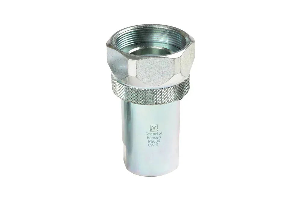 Гнездо быстроразъема GROMELLE с внутренней резьбой BSP, NPT и запорным клапаном, серия W-6000. Быстроразъемное соединение предназначено для применения в условиях высоких механических нагрузок. Допускается скручивание быстроразъема под остаточным давлением до 30 бар. В случае пульсирующего давления при разъединенном соединении, максимальное рабочее давление следует снизить на 50%. Изготовлено в соответствии с директивой PED 2014/68/ЕС. Материал: оцинкованная сталь. Уплотнение: NBR (температура эксплуатации: от -20°C до +100°C), витон (температура эксплуатации: от -20°C до +200°C). Рабочее давление: до 1100 бар (в зависимости от размера быстроразъема). Пропускная способность указана для падения давления 3 бара.