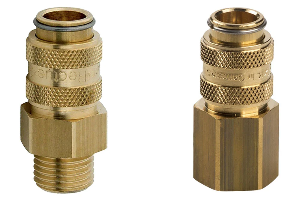 Гнездо быстросъемного соединения с двусторонним отсечением, Евростандарт DN5 (MINI), серия 21KB с наружной или внутренней резьбой BSP. Версия с двусторонним отсечением, имеет клапан в гнезде и в штекере, и не следует соединять версию с односторонним отсечением с двусторонним, так как не произойдет открытие клапана. Широко используется в промышленности, где требуются небольшие размеры при высокой производительности потока и малом падении давления. Возможна работа одной рукой. Производительность: 170 л/мин (Pe = 6 бар, Δp=0,5 бар — воздух), 3,2 л/мин (Δp=1 бар Kv=0,19 — вода). Рабочее давление: 35 бар. Материал: латунь, нержавеющая сталь (пружины и шарики). Уплотнение: NBR. Рабочая температура: от -20°C до +100°C.