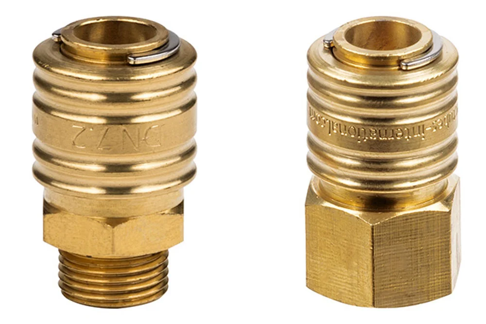 Гнездо быстросъемного соединения двустороннего отсечения, с популярным профилем Eurostandard DN7,2 с клапаном, с наружной или внутренней резьбой BSP или метрической, для использования в пневматических установках (воздух, азот, другие негорючие газы). Версия двустороннего отсечения имеет клапан в гнезде и в штекере, и не следует соединять версию одностороннего отсечения с двусторонней, так как не произойдет открытие клапана. Легко управляется одной рукой при давлении до 8 бар. Рабочее давление: 16 бар. Материал: латунь (штифты и пружина из нержавеющей стали). Уплотнение: NBR. Поток: 734 л/мин, Pe=6 бар, Δp=1 бар (воздух). Рабочая температура: от -20°C до +100°C.