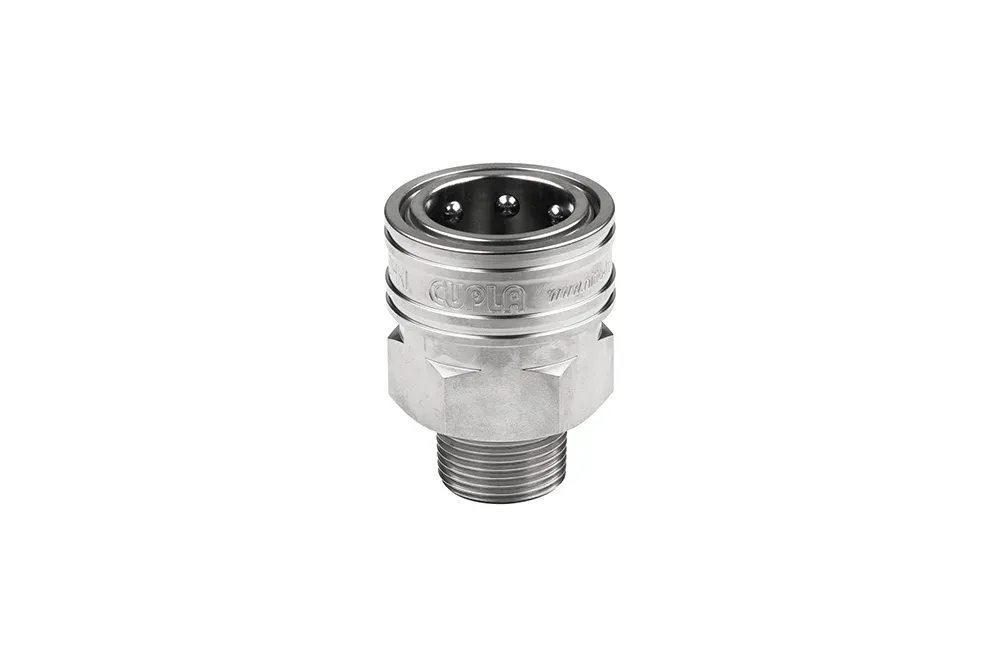 Гнездо быстросъемного соединения полнопроходное Nitto Kohki серия TSP CUPLA с наружной резьбой BSPT, обладающее отличной долговечностью, предназначено для воды, гидравлических масел, пара, химикатов, воздуха и газов. Особенно рекомендуется для жидкостей с высокой вязкостью, например, смазок. Материал: углеродистая сталь. Рабочее давление: 75 бар (1/8″, 1/4″, 3/8″), 45 бар (1/2″, 3/4″, 1″), 30 бар (1.1/4″, 1.1/2″), 20 бар (2″). Рабочая температура: от -20°C до +80°C (NBR).