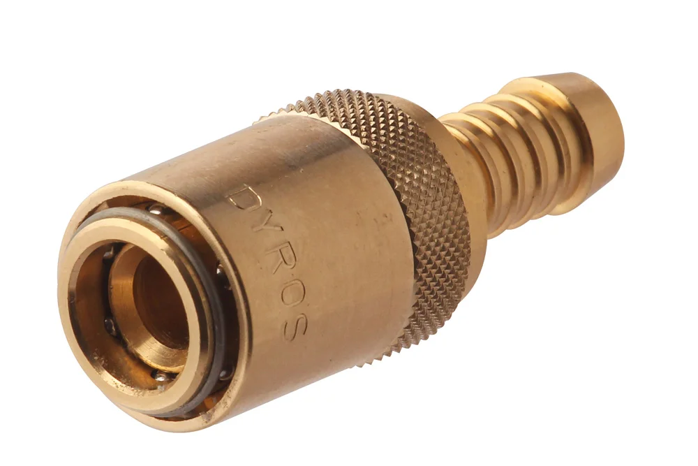 Гнездо быстросъемного соединения DYROS серия 40 с наконечником для шланга без клапана. Предназначено для охлаждающих жидкостей форм в переработке пластмасс, установок сжатого воздуха, баллонов с техническими газами и других областей техники. Материал: все элементы выполнены из латуни, а удерживающие кольца, пружины и шарики из легированной нержавеющей стали. Рабочее давление: 15 бар.