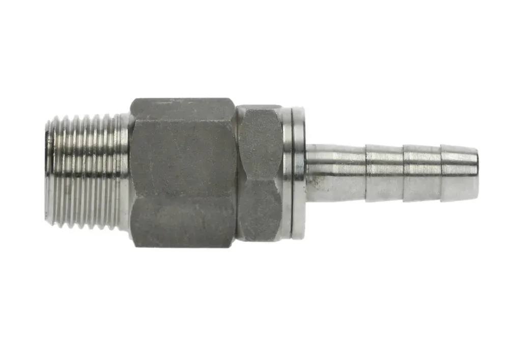 Поворотный наконечник AK с наружной конической резьбой BSPT без фланца. Предназначен для установки в промышленные шланги, в частности в шланги для мойки в месте соединения с водяным пистолетом, где из-за манипуляций с пистолетом требуется его вращение. Материал: сталь AISI 316. Рабочее давление: до 40 бар.