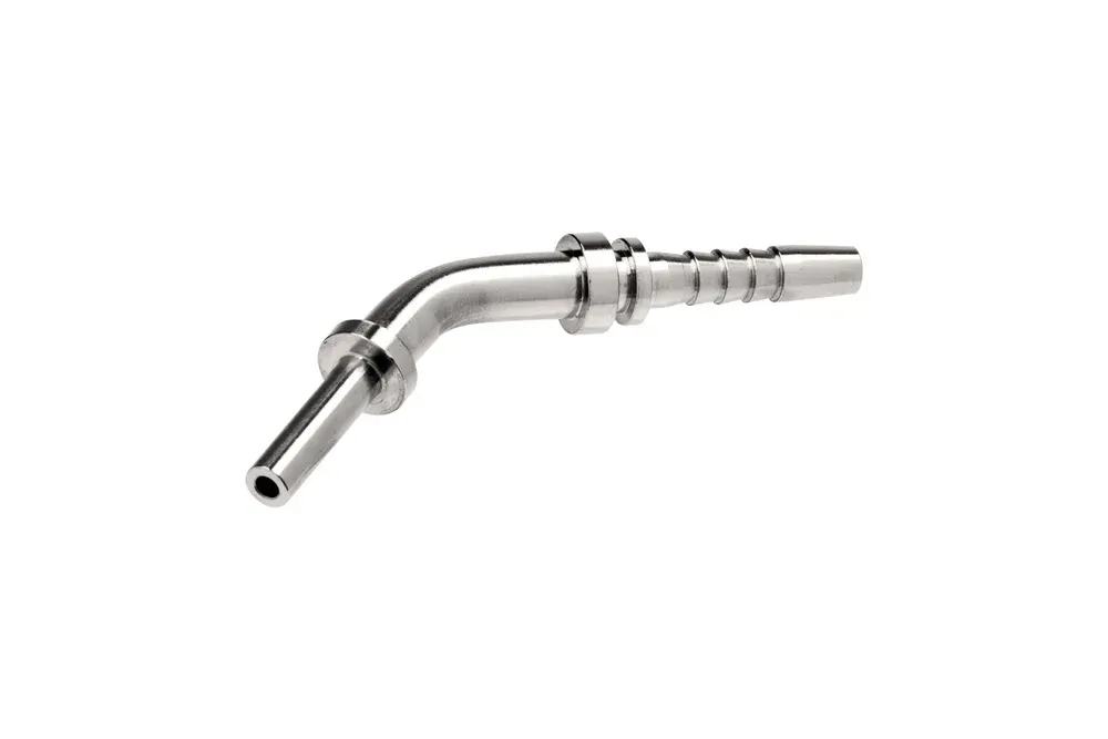 Стандартный гидравлический наконечник (тип Z — с обычным «хвостом» для шланга), с метрической трубкой, уплотнение с помощью режущего кольца (BEL), угловой 45° легкой серии. Предназначен для обжима в гидравлических и промышленных шлангах с помощью обжимной втулки, подходящей для типа шланга. Материал: сталь AISI 316L.