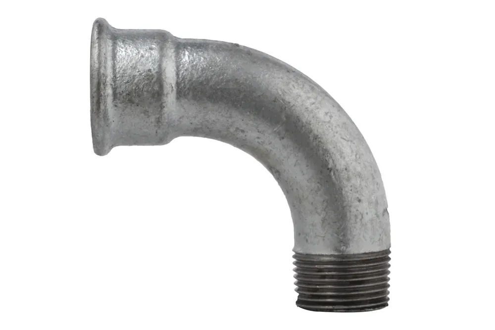 Длинный угол 90° с внутренней резьбой BSP и наружной резьбой BSPT для использования в трубных соединениях промышленных установок. Материал: ковкий чугун. Рабочая температура: до +300°C. Рабочее давление: 25 бар (до +120°C), 20 бар (до +300°C).