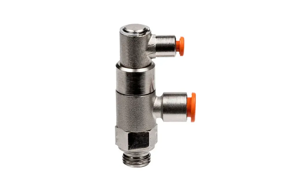 Запорный клапан STOP серии STP-B с быстроразъемными соединениями используется в основном как предохранительный клапан. После установки на питающих соединениях цилиндра он позволяет проходить воздуху только при наличии пневматического управляющего сигнала. Цилиндр останавливается при падении управляющего давления. Рабочее давление: 0,5 ÷ 10 бар. Рабочая температура: от -10°C до +60°C. Материал корпуса: никелированная латунь. Уплотнение: NBR.