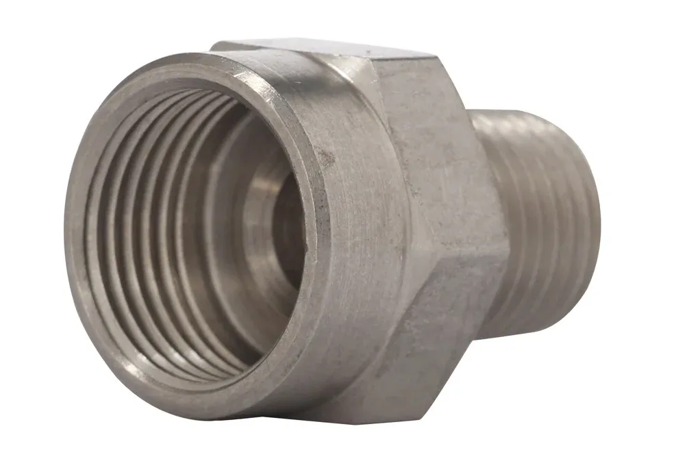 Присоединение с внутренней резьбой 11/16″-18 UNF, позволяющее подключение к гнезду типа 2-HG и 2-HL быстросъемного соединения Hansen Beverage. С другой стороны заканчивается внутренней или внешней резьбой. Рабочее давление: 15 бар. Рабочая температура: до +130°C. Материал: сталь AISI 303.
