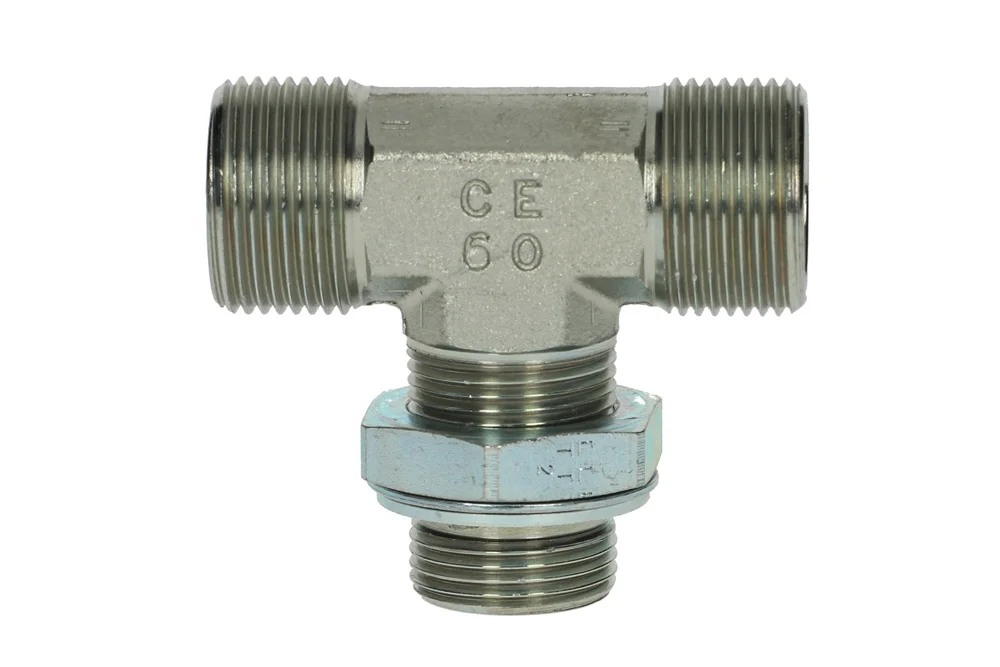 Присоединительная деталь DIN 2353 ввертная тройниковая регулируемая, тип TE-BG: седло 24° DIN 2353 с метрической наружной резьбой и с наружной резьбой BSP (уплотнение ISO-1179 тип G — с уплотнительным кольцом и фиксирующим кольцом). Коэффициент безопасности 4:1. Выпускается в вариантах: L (легкая серия), S (тяжелая серия). Материал: углеродистая сталь, оцинкованная.