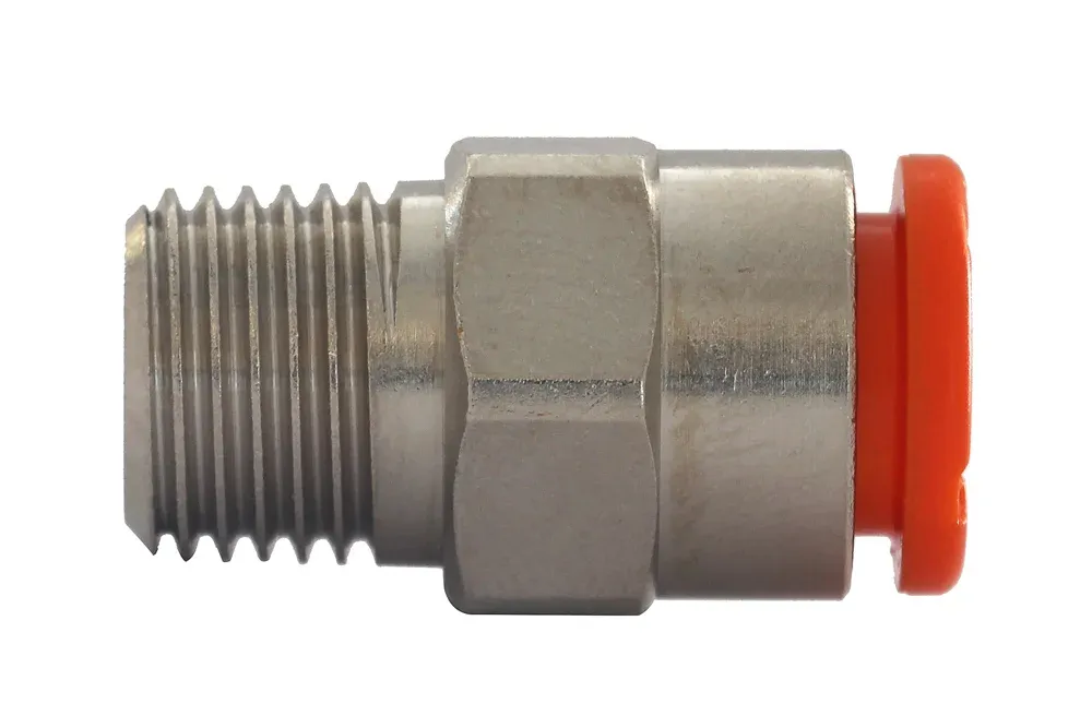 Прямая вставная муфта с наружной конической резьбой, тип R1C, предназначена для соединения трубопроводов и других элементов в пневматических системах. Легкая и быстрая в использовании для многократной сборки без потери герметичности с механической и пневматической стороны. Материал: никелированная латунь. Рабочее давление: 16 бар. Рабочая среда: вакуум, воздух. Температура эксплуатации: от -20°C до +80°C. Уплотнение: NBR.