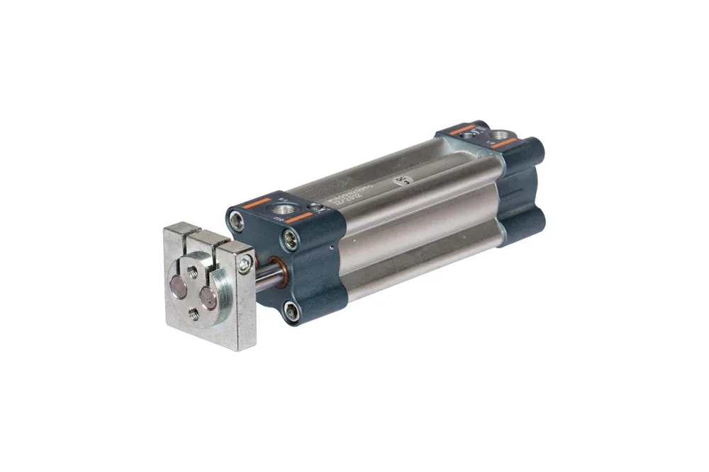Двухсторонний цилиндр с проходящим двойным штоком может использоваться как исполнительный элемент в системах, где требуется защита от вращения. В осевом размере соответствует стандарту ISO 15552. Стандартная конфигурация с магнитом и амортизацией. Диаметр поршня: Ø 32, 40, 50, 63, 80, 100 мм. Максимальная рекомендуемая длина хода: от 25 до 500 мм. Рабочее давление: до 10 бар. Уплотнение: полиуретан. Рабочая среда: фильтрованный сжатый воздух, смазанный или несмазанный. Силы, создаваемые при 6 бар выдвижение/возврат: Ø 32 — 434/350 Н, Ø 40 — 678/597 Н, Ø 50 — 1060/940 Н, Ø 63 — 1683/1471 Н, Ø 80 — 2714/2295 Н, Ø 100 — 4241/3812 Н. Рабочая температура: от -10°C до +80°C.