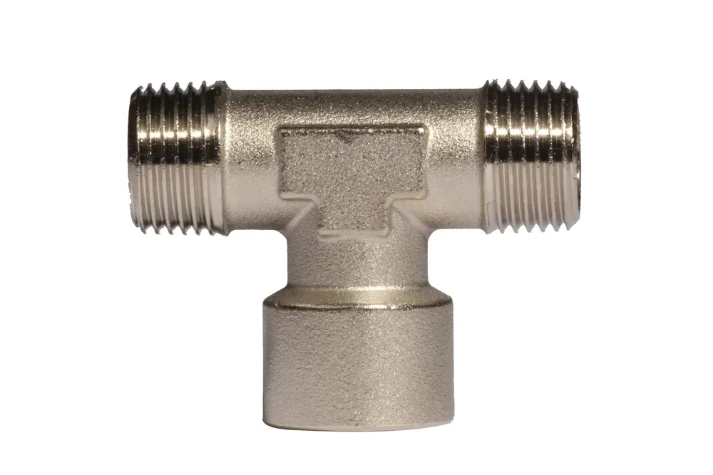 Тройник «Т» с двумя наружными резьбами BSPT и одной внутренней резьбой BSP тип A17, предназначен для соединения элементов пневматики (включая шланги) между собой. Герметичность соединения обычно требует использования дополнительных уплотнений. В случае конической резьбы используется тефлоновая лента или герметик, в случае цилиндрической резьбы — алюминиевые или медные прокладки. Материал: никелированная латунь. Рабочее давление: 60 бар.