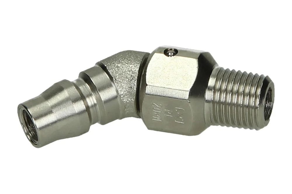 Штекер без клапана Nitto Kohki ROTARY PLUG с наружной резьбой. Быстроразъемное соединение с односторонним отсечением, предназначенное для соединения пневматических устройств и инструментов. Имеет вращающуюся соединительную часть штекера с резьбой, позволяющую вращение на 360°. Соединение под углом 45° с инструментом позволяет устранить сопротивление, передаваемое подключенным шлангом. Штекеры могут быть соединены с гнездами Nitto Kohki серии HI CUPLA. Рабочая температура: от -20°C до +80°C. Рабочее давление: 15 бар.