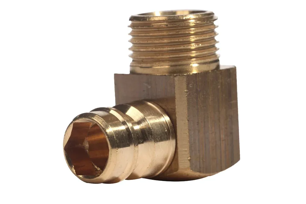 Штекер быстросъемного соединения 90° DYROS серия 90 с наружной резьбой без клапана. Доступен с метрической резьбой или BSP. Предназначен для охлаждающих жидкостей в формах при переработке пластмасс, установок сжатого воздуха, баллонов с техническими газами и других областей техники. Материал: латунь. Рабочее давление: 15 бар.