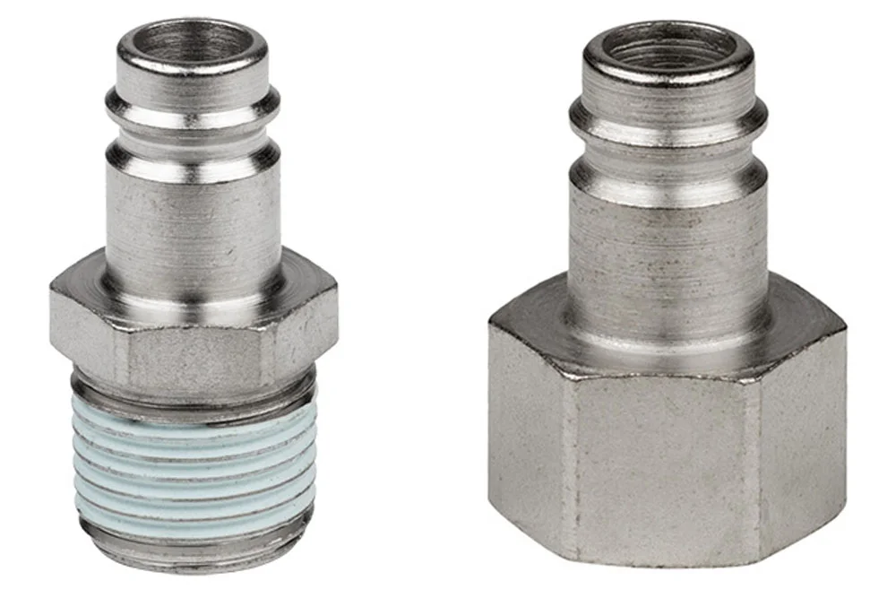 Штекер быстросъемного соединения без клапана, стандартного профиля EURO DN10, с наружной резьбой BSPT или с внутренней резьбой BSP, серия 27KA. Рабочее давление: 35 бар. Материал: никелированная закаленная сталь. Рабочая температура: от -20°C до +100°C.