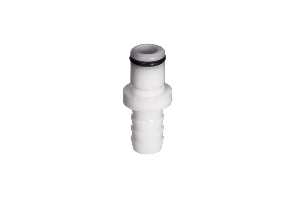 Среднего размера штекер быстросъемного соединения без клапана с наконечником для шланга, предназначенный для моечных установок, фильтрации деионизированной воды, промышленных автоматов, обнаружения утечек и т.д. Длина L [мм] — общая длина. Материал: ацеталь. Уплотнение: о-ринг из NBR. Рабочее давление: до 8,3 бар. Рабочая температура: от -40°C до +82°C.