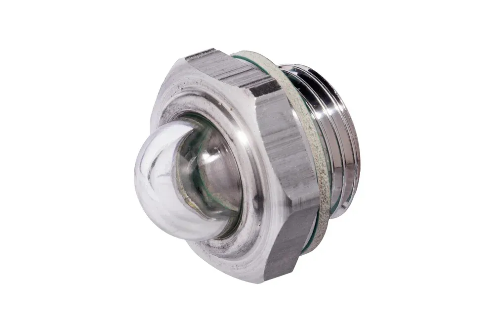 Смотровое стекло предназначено для контроля уровня гидравлического масла, устанавливается на боковой стенке резервуара. Сферическая форма смотрового отверстия позволяет наблюдение сбоку. Диаметр D [мм] — размер смотрового отверстия. Материал: алюминий (корпус), полиамид (смотровое отверстие), гуарниталь (фибровая прокладка). Рабочая температура: от 0°C до +80°C.
