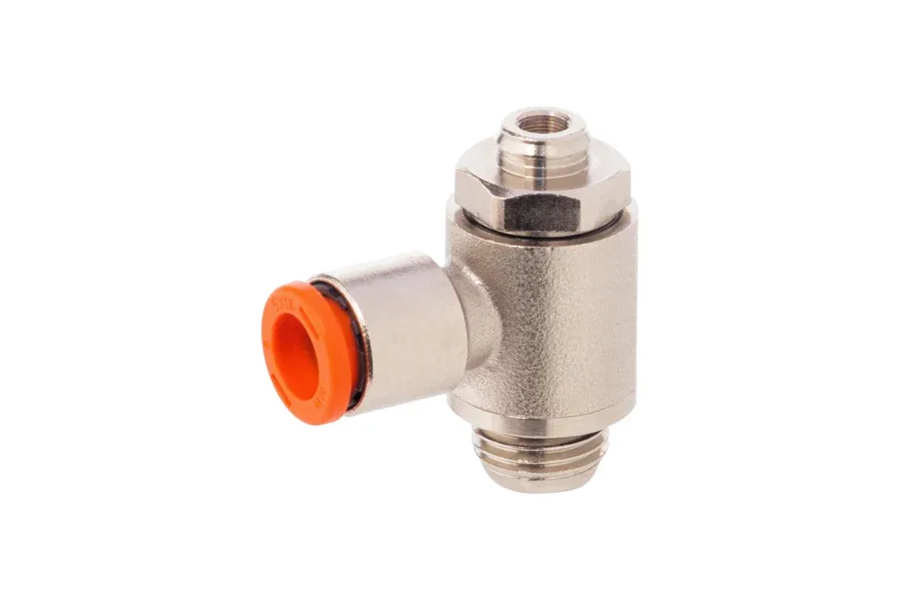 Дроссельно-обратный клапан тип MRF OMC серия COMPACT «O» для непосредственного монтажа в соединениях цилиндра, используемый в пневматических системах для регулирования расхода потока сжатого воздуха и направления потока. Оснащен штекерным соединением, обеспечивающим легкий демонтаж пневматических трубопроводов. Изменение настройки с помощью отвертки, с возможностью установки защитного кожуха. Размер: M5, 1/8″, 1/4″, 3/8″, 1/2″. Рабочее давление: до 10 бар. Рабочая температура: от -10°C до +70°C. Материал: никелированная латунь.