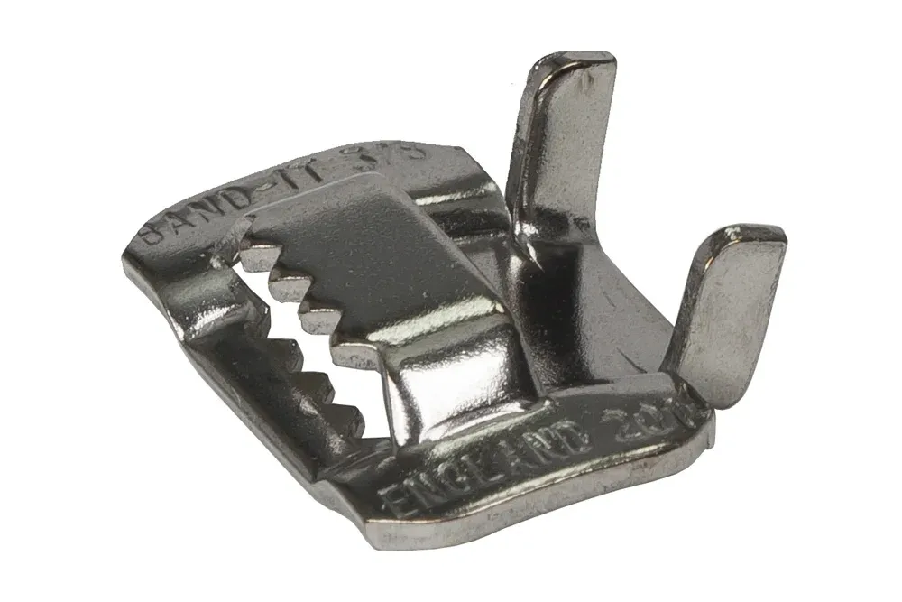 Зажимы для ленты системы Band-It® Standard. Зажимы с так называемыми «носиками» защищают конец ленты после загиба. Материал: сталь AISI 316.